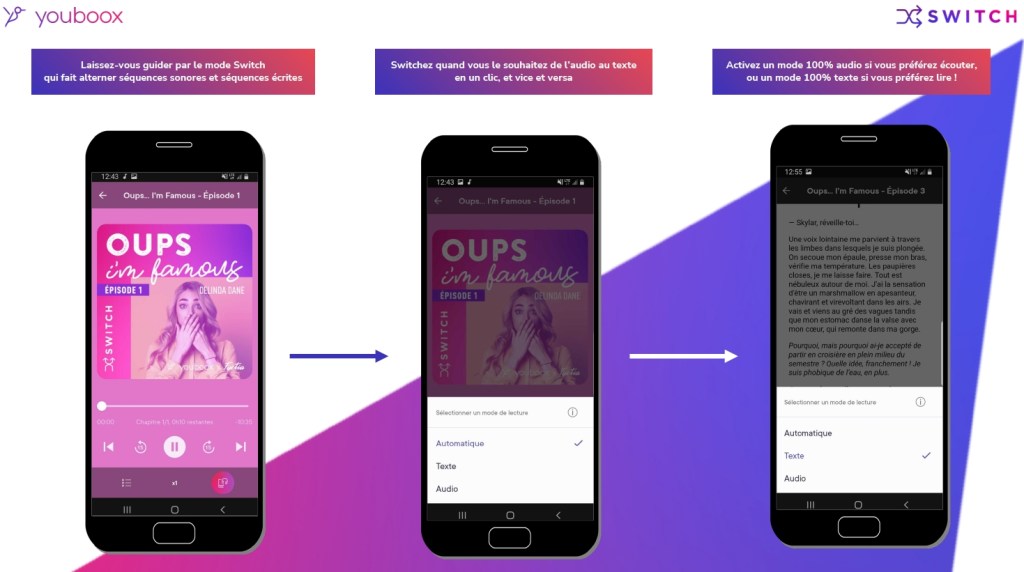 Pour les lecteurs, ou plutôt les audiolecteurs, Switch est une nouvelle expérience de lecture, différente des livres audio traditionnels. L’audio est davantage immersif, avec des bruits d’ambiance, de la musique originale.