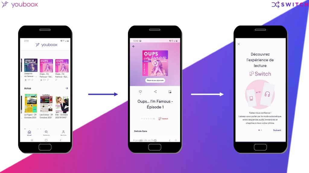 Vous connaissez sans doute la Switch de Nintendo ? On passe de la console télé à la console portable, on switche de console, quoi ! Et bien là, c’est le même principe mais en lecture. Quel lecteur n’a jamais rêvé de poursuivre son roman papier en audio parce qu’il devait prendre la voiture ou autre ? On écoute le roman ou on le lit, on change de format à chaque chapitre… Bref, on gère notre mode de lecture selon nos envies !