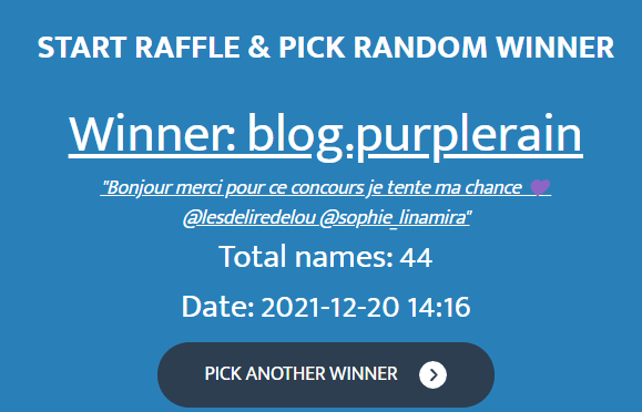 Le tirage au sort se fera dans les jours qui suivent et les résultats seront publiés par la suite. L’envoi du livre sera fait par mes soins.